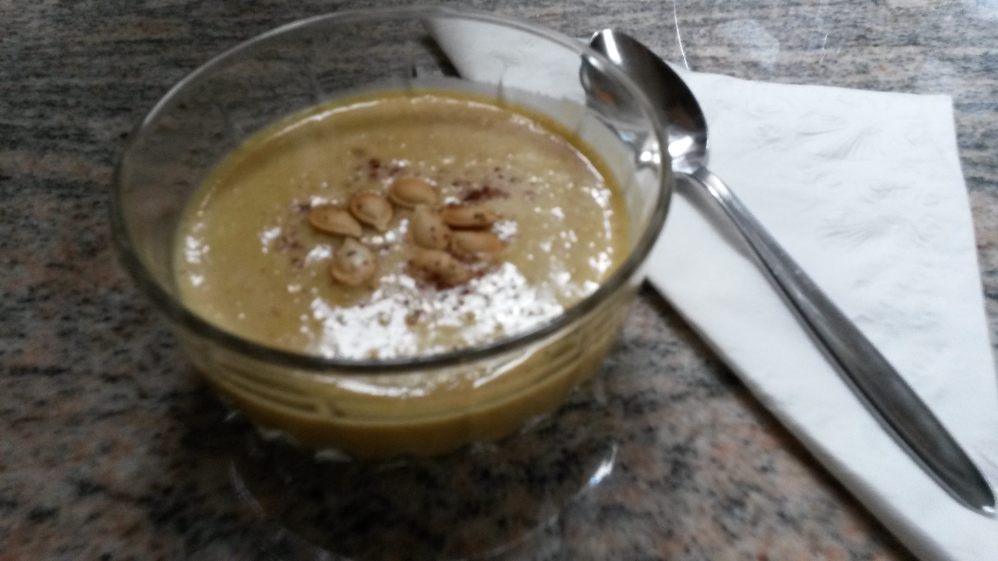 10. Serve in small bowls; garnish with toasted pumpkin seeds and a sprinkle of nutmeg or cinnamon to taste